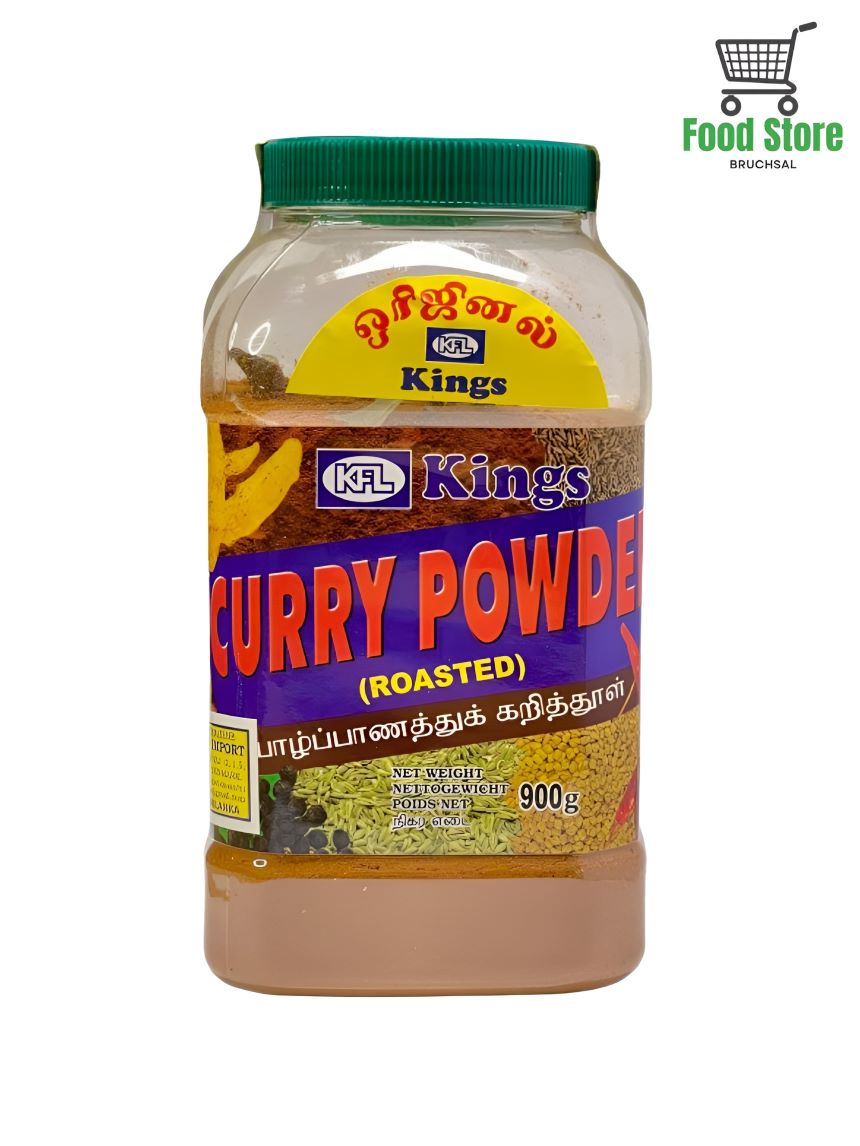 Das ist geröstetes Curry-Pulver von Kings in einer 900-g-Packung, zum Würzen von Currys und anderen Gerichten.
