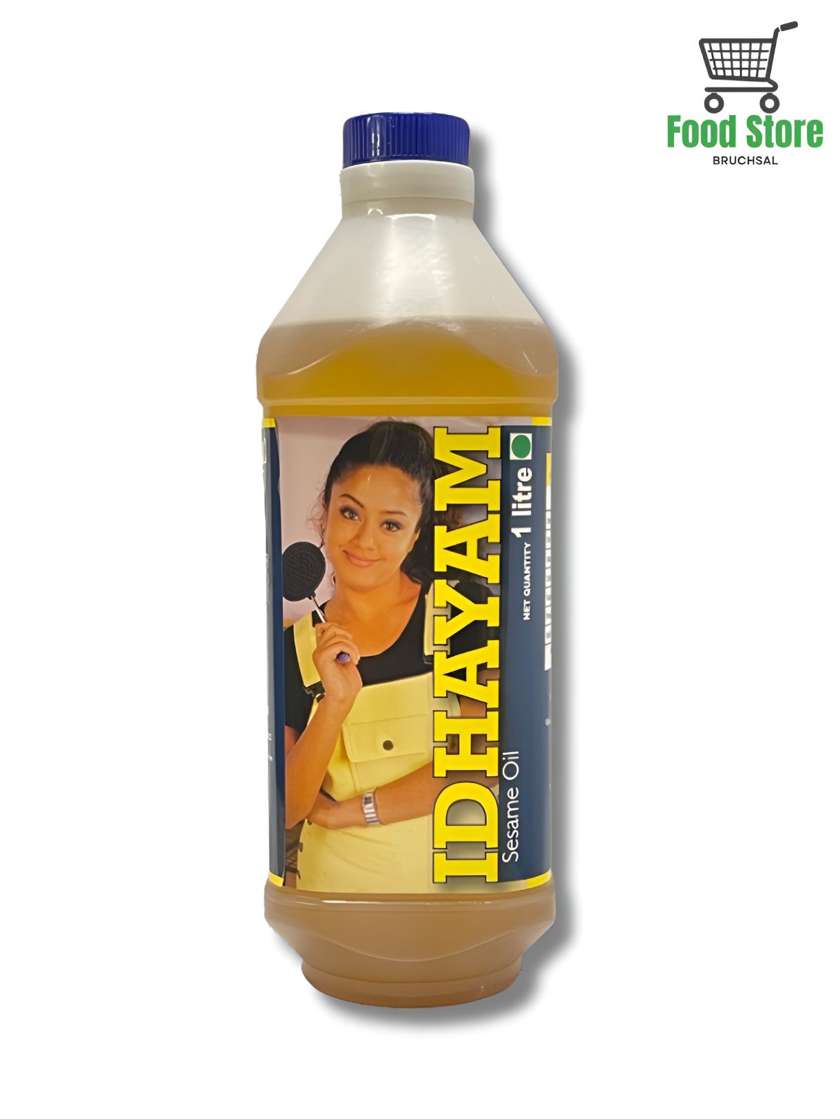 Das ist Sesamöl von Idhayam in einer 1-Liter-Flasche, oft zum Kochen oder für die Gesundheit benutzt.